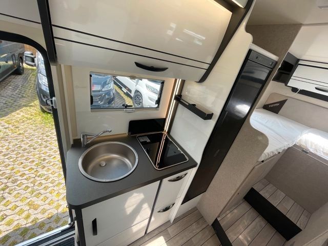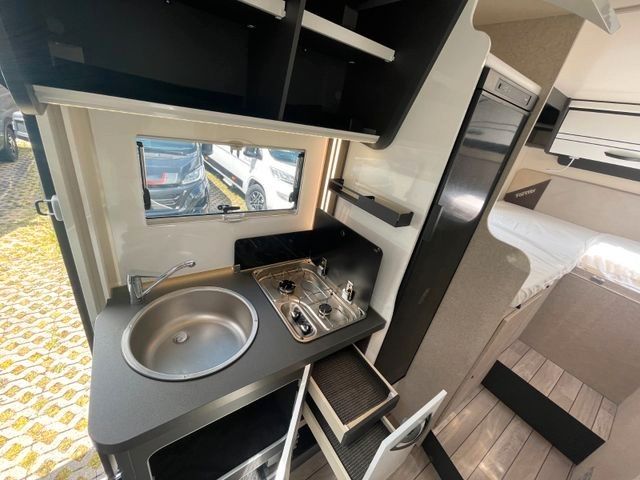 - Küche mit Edelstahlspüle, Schubläden, Oberschränken, großen Kühlschrank (12V/230V/Gas)