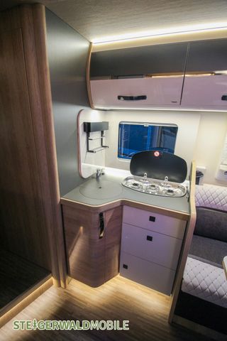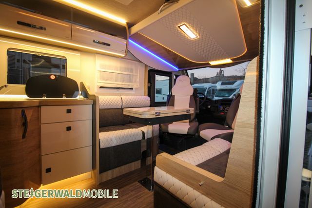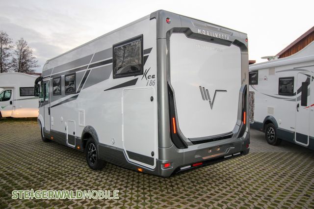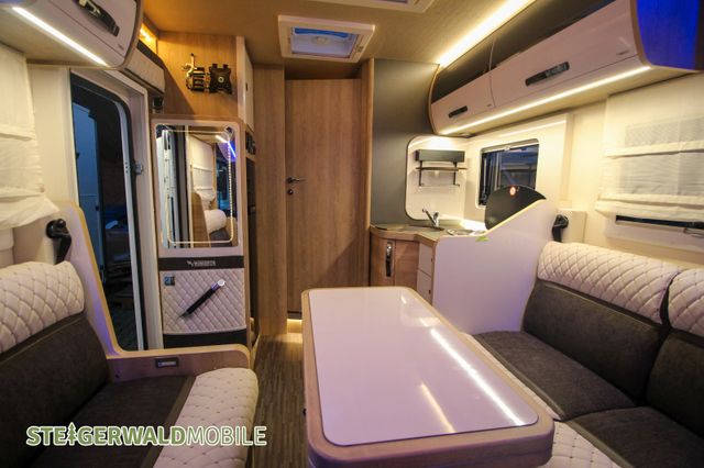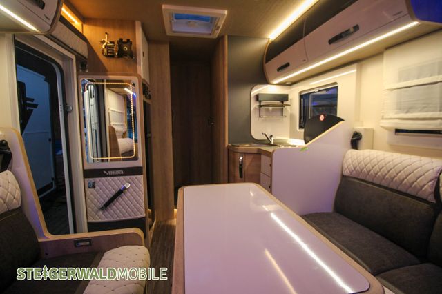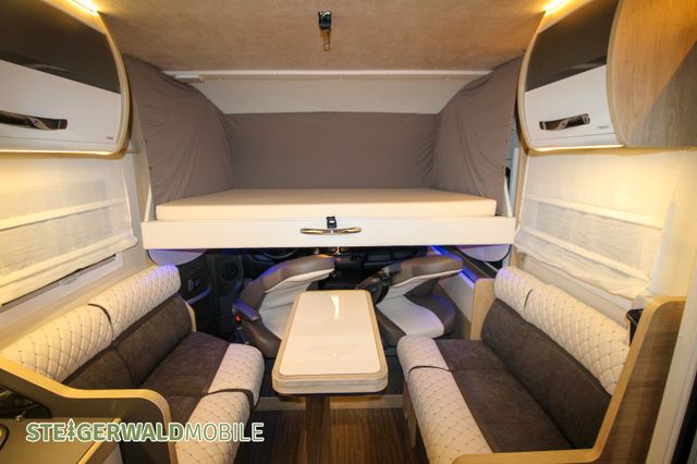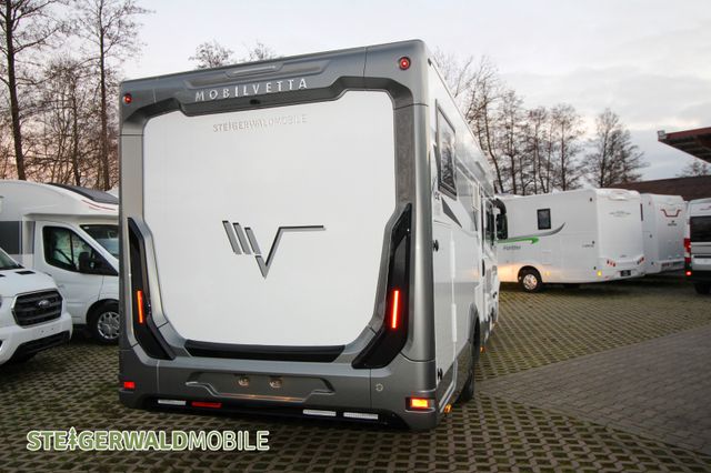 Vollintegrierter von MOBILVETTA mit Längsbetten im Heck und face to face Sitzgruppe