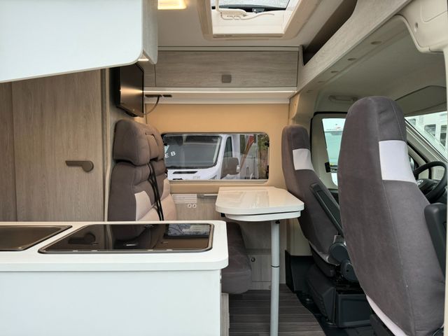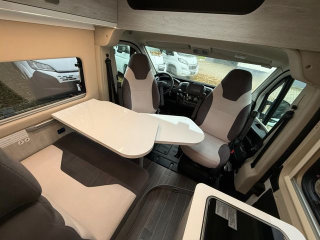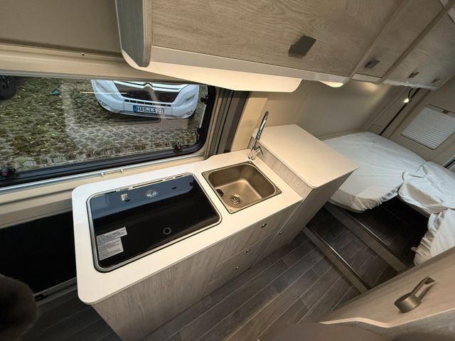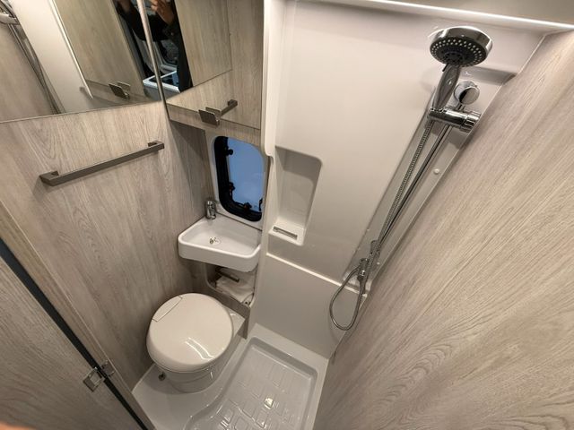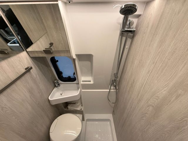 - seperate Nasszelle inkl. Fenster, Casettentoilette mit SOG WC Entlüfter (keine Chemie nötig), Waschbecken, Dusche, Utensilienschrank und Spiegel