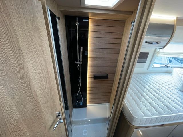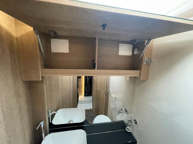 - Nasszelle mit Casettentoilette, Utensilienschrank mit Spiegel, 230V Dose (zum Haare fönen), Dachfenster