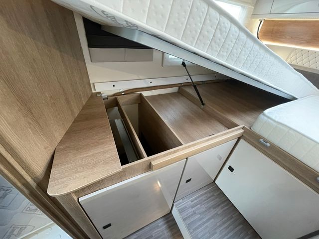 - Längsbetten im Heck / 2,05x0,80m + 2,00x0,80m oder Riesenbett. inkl. Lattenrost, klappbar zum leichteren Befüllen des Kleiderschrankes