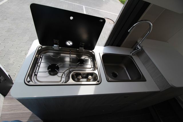 - Küchenzeile mit Edelstahlspüle, hochwertigem Wasserhahn, 2-Flamm-Kocher mit Glasabdeckung, große Schubladen, Oberschränke