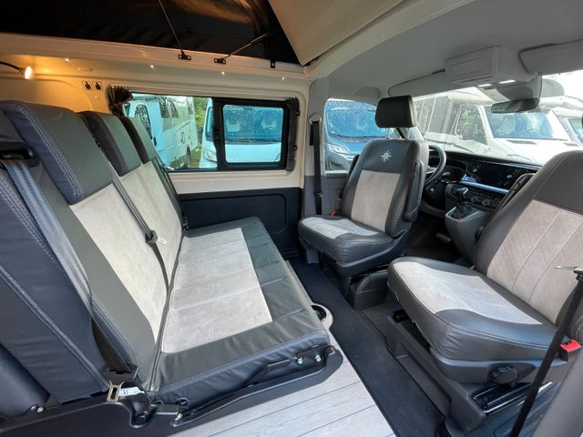 Westfalia Kepler Five, der kompakte Van mit 5 Sitzen, König der Freizeitausflüge Aus der breiten Palette der von Westfalia eingerichteten Vans werden Sie dem Kepler Five Kollektion 2022 nicht widerstehen können. Dieser Combivan mit Aufstelldach auf Volkswagen T6.1 ist nicht nur eines der vielseitigsten Modelle der Marke, sondern mit nur 4,90 m auch das kürzeste! Mit seinen 5 Straßensitzen, seiner Höhe von 2 m und seiner Campingausstattung passt sich dieses Straßenchamäleon jeder Situation an: Es fühlt sich in der Stadt wohl und ist bereit für Freizeitausflüge.Westfalia Kepler Five: Wenn der VW T6 zum idealen Abenteuerbegleiter für Duos oder Familien wird...----
