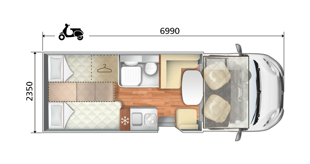 Fahrradträger, Markise, Klimaanlage (während der Fahrt), Radio, Rückfahrkamera, Solar und SOG-Toilette.